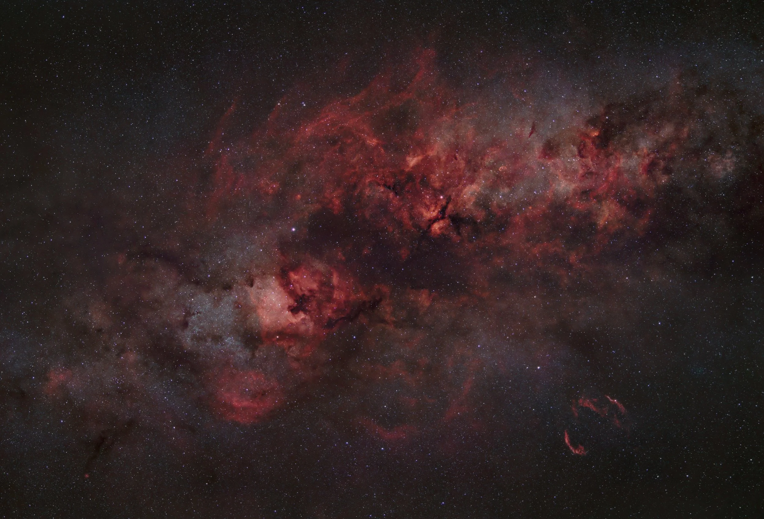 The two images of the Cygnus region below were enhanced by mixing in sub-frames taken with a hydrogen-alpha clip filter (Astronomik 12nm). It fits into the body of my Canon full frame mirrorless camera. This allows only the narrow range of red light emitted by ionised hydrogen to hit my camera’s sensor and picks out the shapes of dust and gas.