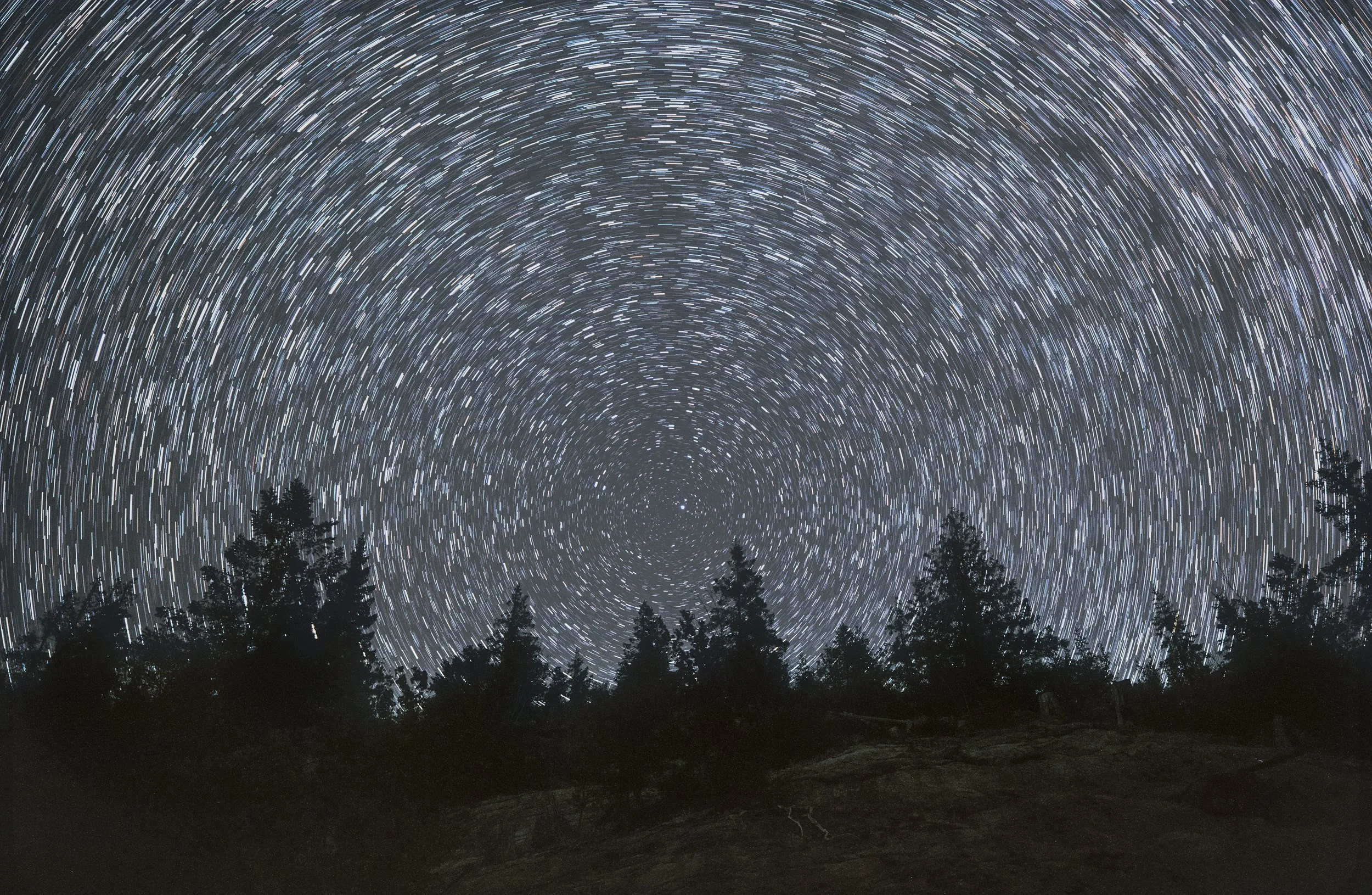 In this image above the time-lapse has been converted tino a still photograph to show how the rotation of the earth causes the stars to move through my field of view in streaks. They all revolve around the Pole Star - that’s the biggest one in the centre. You can see it’s slightly offset to the top right, so it’s not exactly the centre point, but pretty close. The furthest stars from Polaris move fastest and can rise and set below the horizon in a single night.