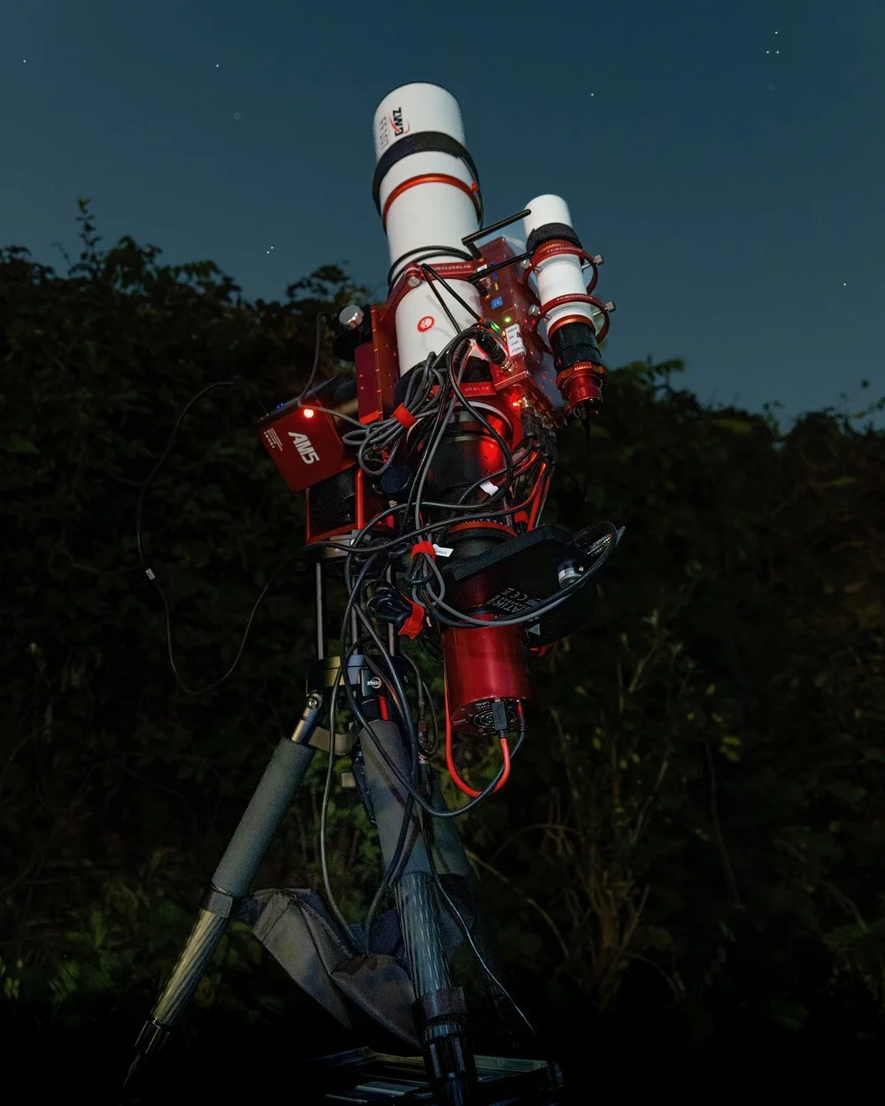 In the Northern Hemisphere all targets rotate like this. Taking long exposures, a telescope must track them precisely to account for the rotation so that the stars appear round, not streaky. The AM5 mount is pretty accurate at following the sky. But to gain an extra level of precision the white mini telescope you can see fixed on top takes a frame every half a second and executes the tiniest of nudges to offset any error.